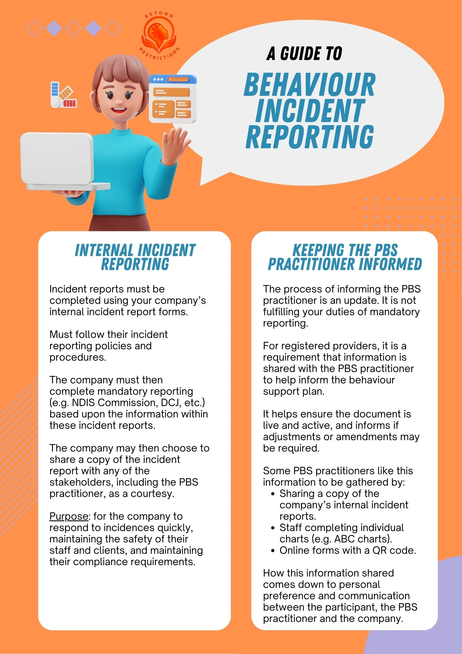This resource has been developed to support providers to clearly understand the difference between internal incident reporting responsibilities and when and how incidents should be shared with a Behaviour Support Practitioner.